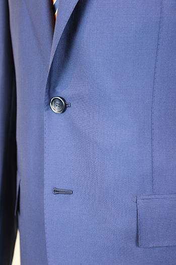 夏らしさのあるブルーの生地は、やや広めのVゾーンの2ボタンで仕上げています。 光沢感のある蝶貝のボタンを付けていますが、アンティーク風のメタルボタンもご用意しております。