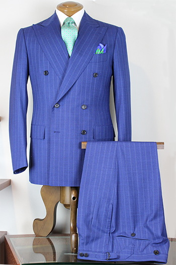 クラシックなストライプ柄のDBスーツは、1930年代を彷彿とさせる大きなラペルでノーベントの仕様。