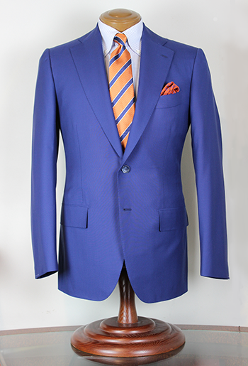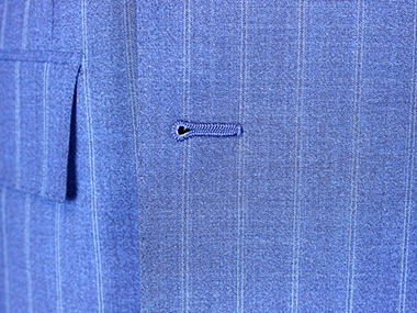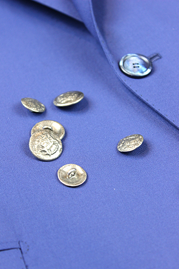 夏らしさのあるブルーの生地は、やや広めのVゾーンの2ボタンで仕上げています。 光沢感のある蝶貝のボタンを付けていますが、アンティーク風のメタルボタンもご用意しております。