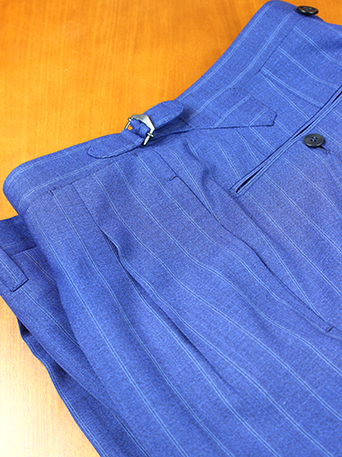 ベルトレスのスラックスは、リバースプリーツのサイドアジャスター付で拘った作りになっています。